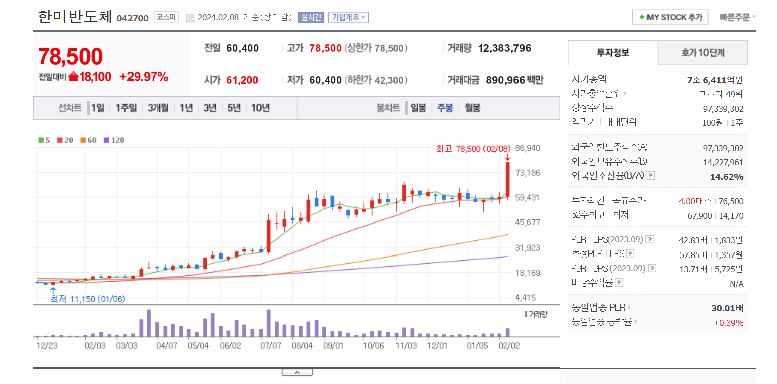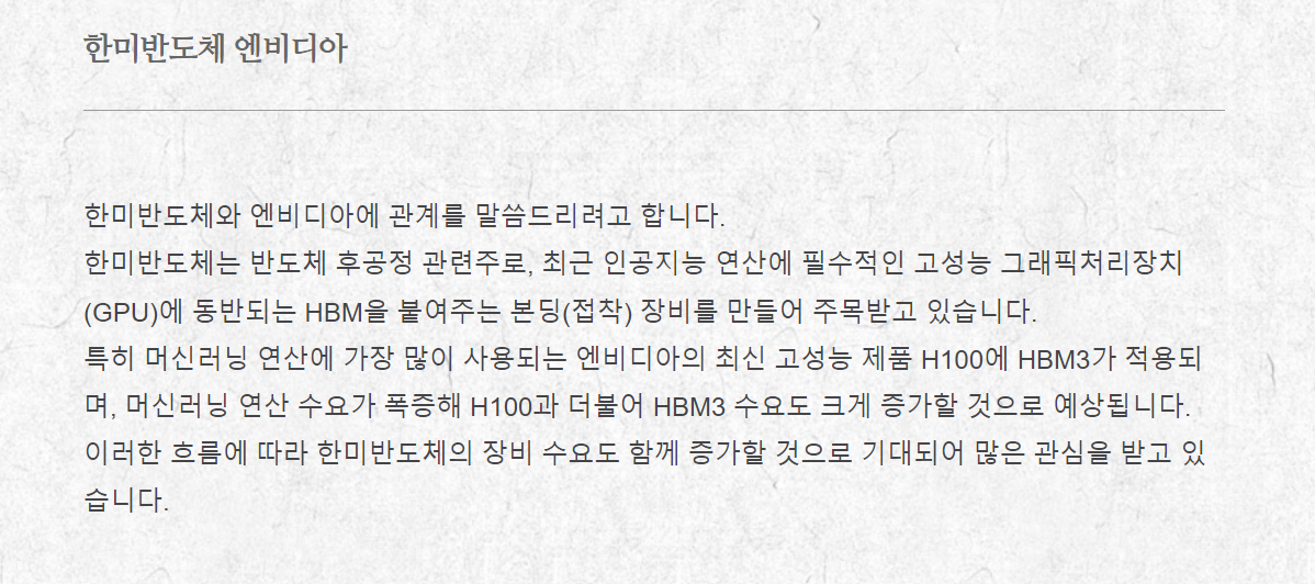 엔비디아와 관련된 AI반도체에 필수적인 HBM관련주는 추세적인 상승을 보여왔다. 그 대장주 격인 한미반도체 또한 마찬가지였다. 23년 12월 6일, 전자상거래 플랫폼업체인 카페24는 '구글260억원 투자유치'를 재료로 장시작과 함께 상한가로 직행했으며. 다음날도 상한가로 시작한 이후 조금 밀려 19%상승한 채 마감 하였다.