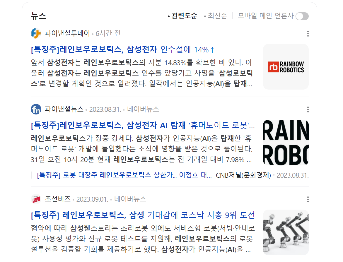 세 번째, 삼성, 네이버, 카카오 같은 국내 대기업과 엮이거나 애플, 구글과 같은 글로벌 대기업과 관계된 뉴스가 좋다. 2022년 삼성전자의 낙수효과를 280조 원으로 추산할 만큼 대기업의 경제적 파급력이 크다. 그런 대기업과 연결되는 뉴스를 띄우면 매수심리를 자극하기 충분하다. 2023년 8월 31일, '[특징주] 레인보우로보틱스, 삼성잔자 AI 탑재 '휴머노이드 로봇' 개발 착수 강세'라는 제목의 뉴스가 나왔다.