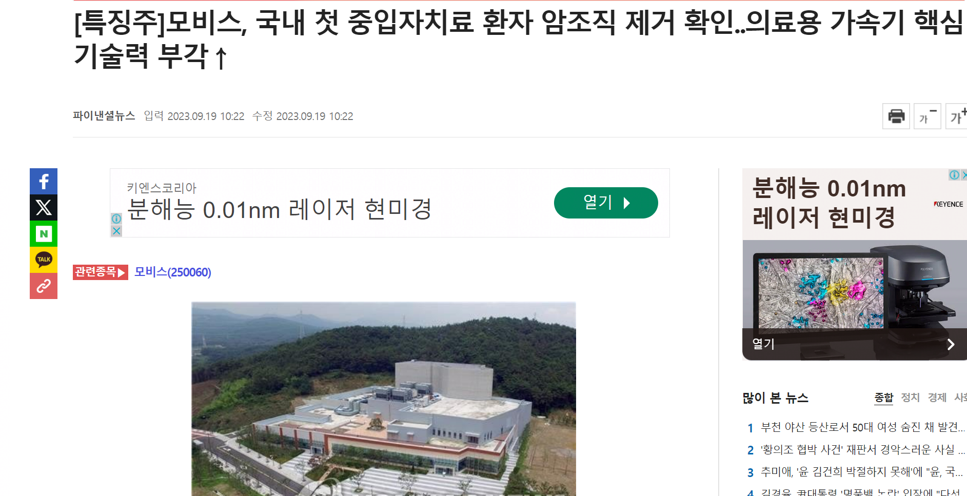 2023년 9월 19일의 뉴스를 한번 보자. [특징주] 모비스, 국내 첫중입자치료 환자 암조직 제거 확인...