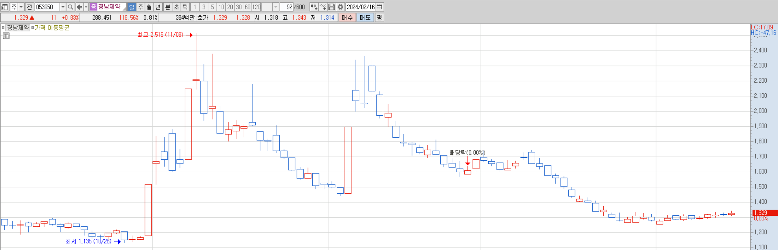 인산가는 후쿠시마 오염수 방류 관련 종목이다. 오염수는 정해진 날이 되면 방출되므로 재료가 소멸할 수 있으며 뉴스 플로우에 영향을 많이 받는다. 이런 종목은 눌림매매의 관점보다는 뉴스가 핫할 때 돌파매매의 관점에서 매매해야 하는 종목이다. 빈대 관련주인 경남제약의 사례도 마찬가지다.(2023년11월차트)