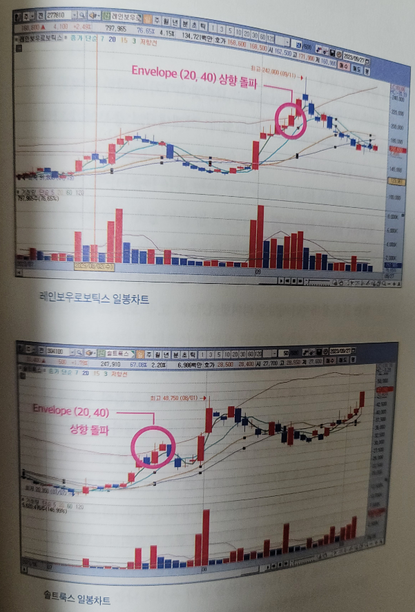 마찬가지로 로봇 테마 주도주였던 레인보우로보틱스도 같은 기준에 따라 관심 종목에 추가할 수있다. 다만 2023년 9월 로봇주는 두산로보틱스 상장이라는 재료가 섞여 있고 이는 다소 단발성 이슈로 인식될 수 있다. 같은 테마라고 하더라도 상황에 따라 대응을 달리해야 한다.