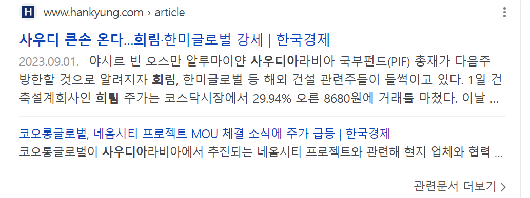 또다른 사례를 한번 보자. 희림이라는 회사는 사우디 네옴시티 관련주이다. 2023년9월1일, "사우디 큰손 온다"... 희림 한미글로벌 강세(한국경제)